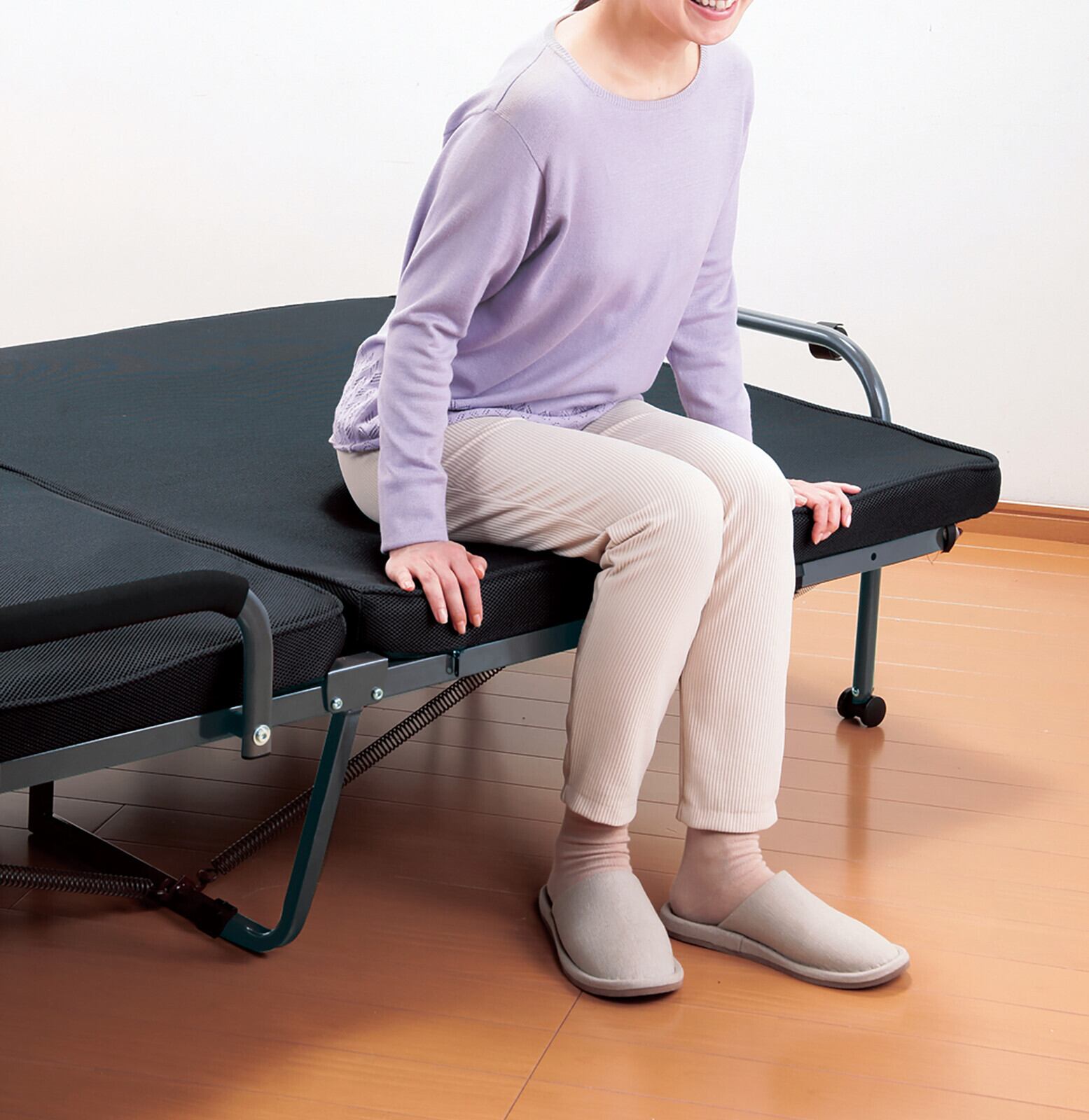 ●ベッド脇のアームを軽く持ち上げるだけで折りたためます